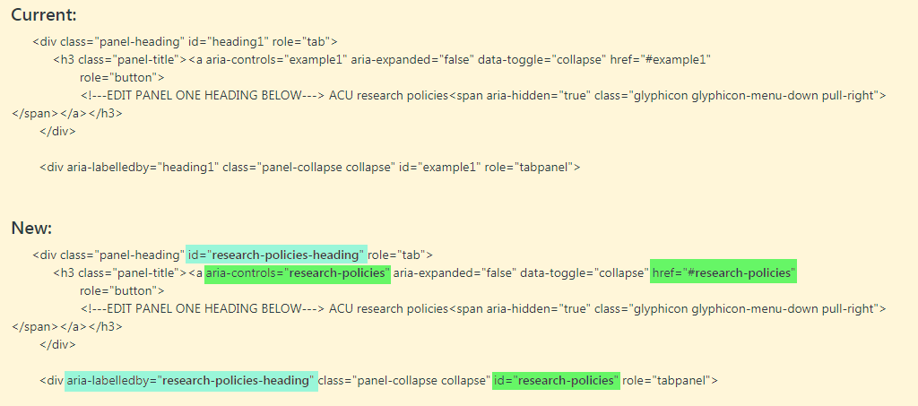Editing the accordion panels in HTML can be fiddly. Formatting will need to be done with HTML (e.g. hyperlinks, bulleted lists). Have a look at the video below. If you prefer Digital Services can put your content into the accordions: